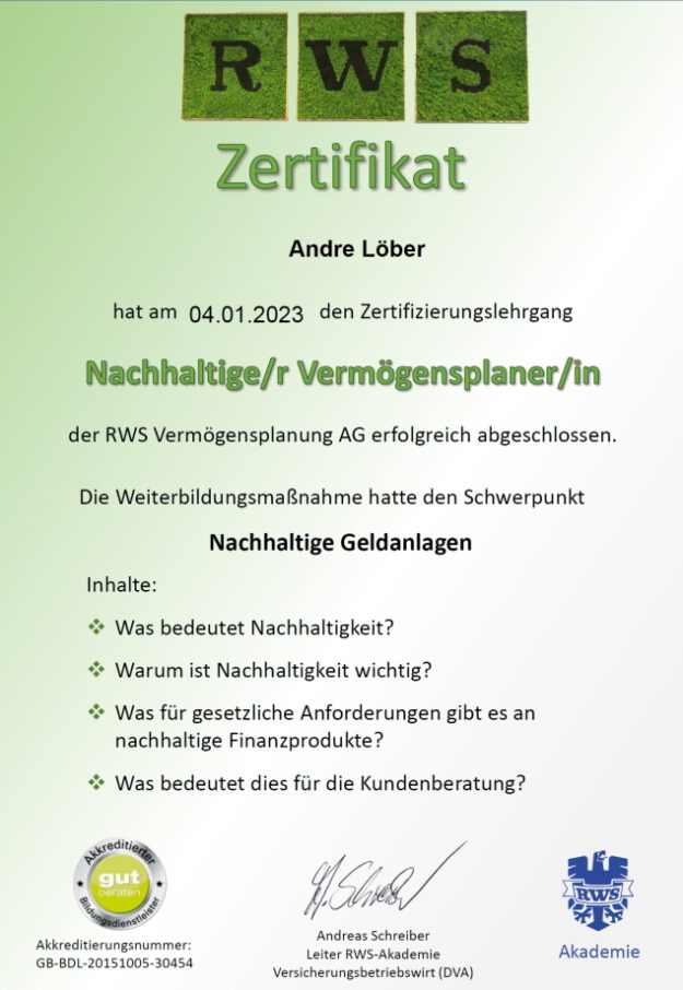 Mit der Zertifizierung als Bildungsdienstleister gehen wir gemeinsam mit der Brancheninitiative gut beraten den Weg in die endlich verpflichtende Weiterbildung aller im Kundenberatungsprozess unmittelbar beteiligten Personen, wie dies auch in anderen freien Berufen längst Praxis ist. Dies wird nochmals zu einer weiteren Beratungsqualitätssteigerung zum Wohle unserer Kundinnen und Kunden führen.